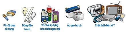 - Các loại chất thải thu gom: Bóng đèn, pin hư cũ, vỏ chai lọ đựng hóa chất nguy hại; Ắc-quy hư cũ; Chất thải điện tử.